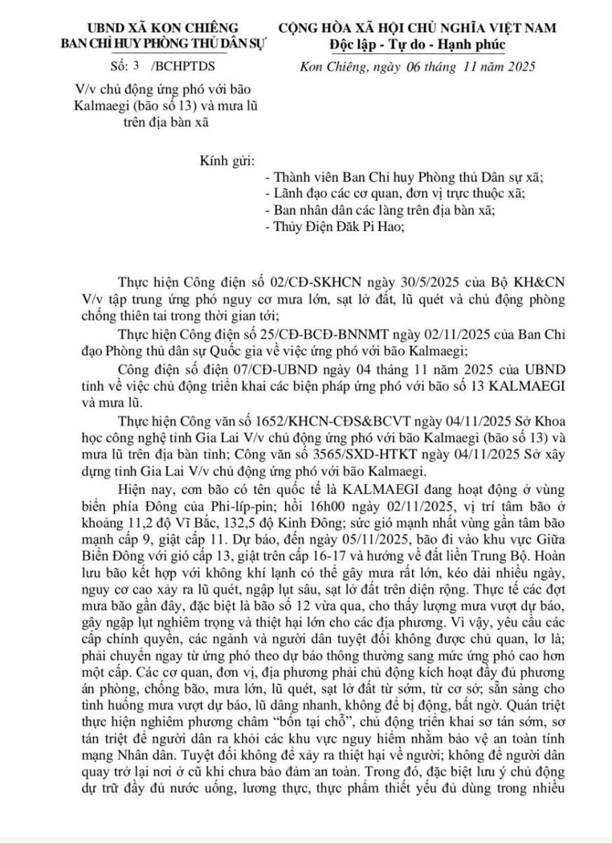 Thứ năm, 06/11/2025 | 14:06 A- A A+ | V/v chủ động ứng phó với bão Kalmaegi (bão số 13) và mưa lũ trên địa bàn xã Chia sẻ Đọc bài Lưu